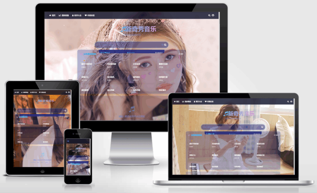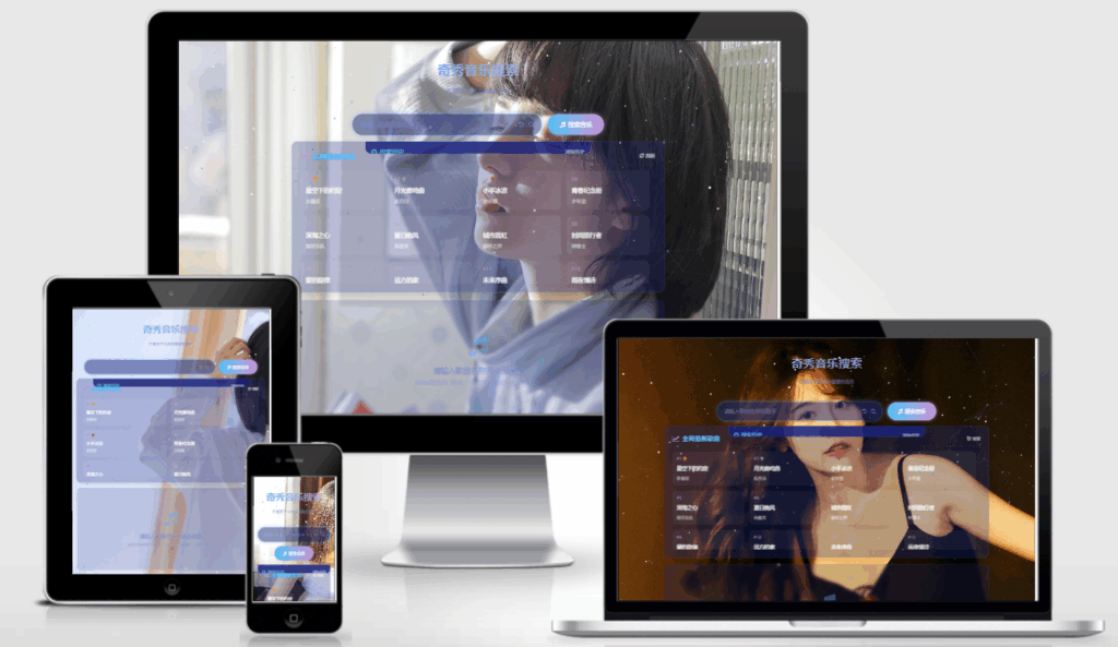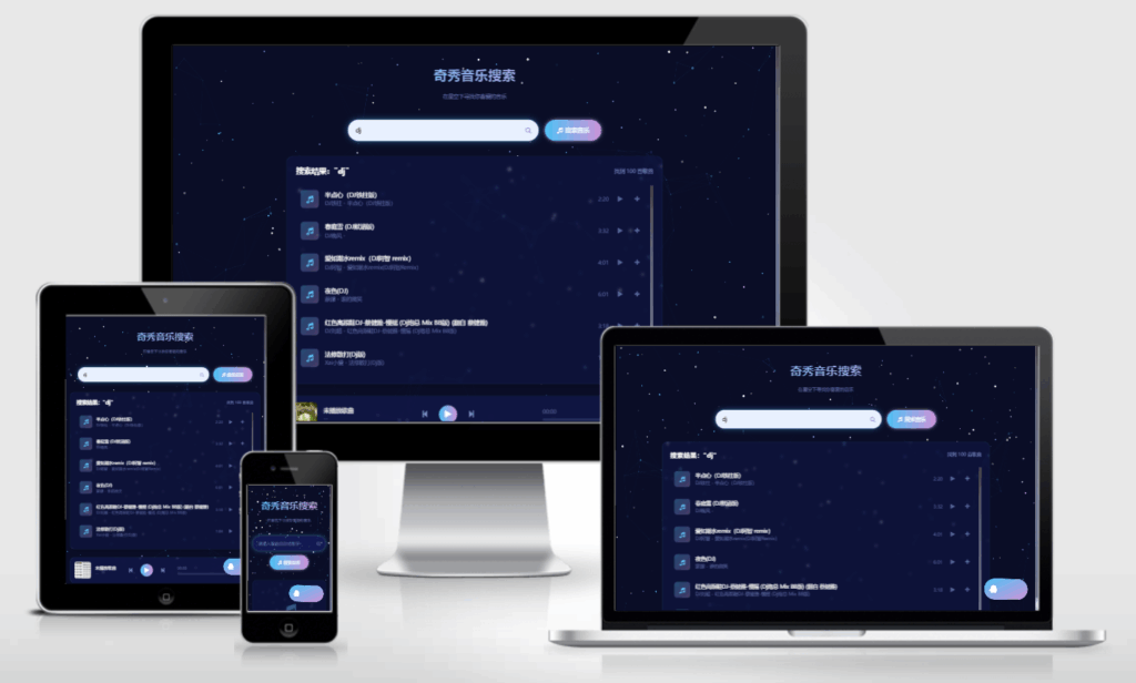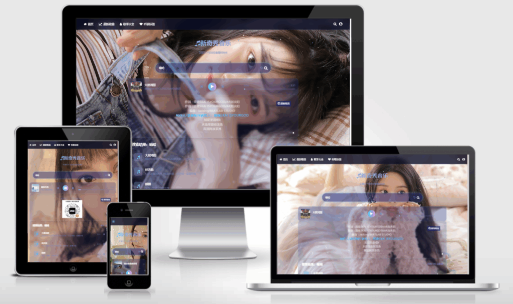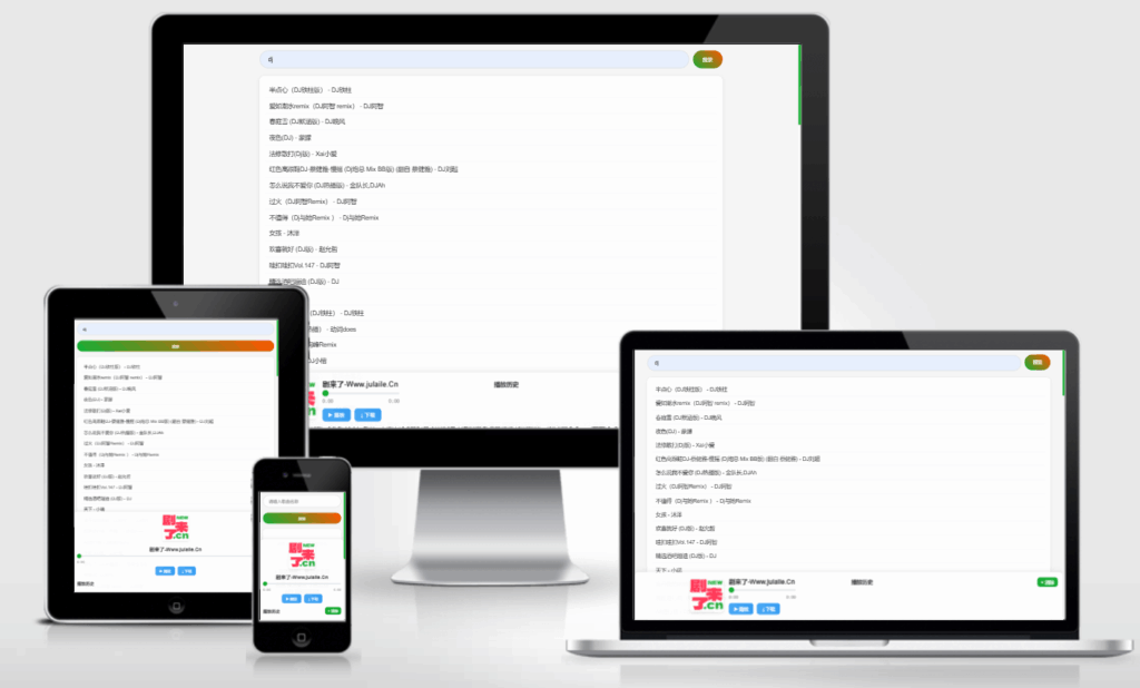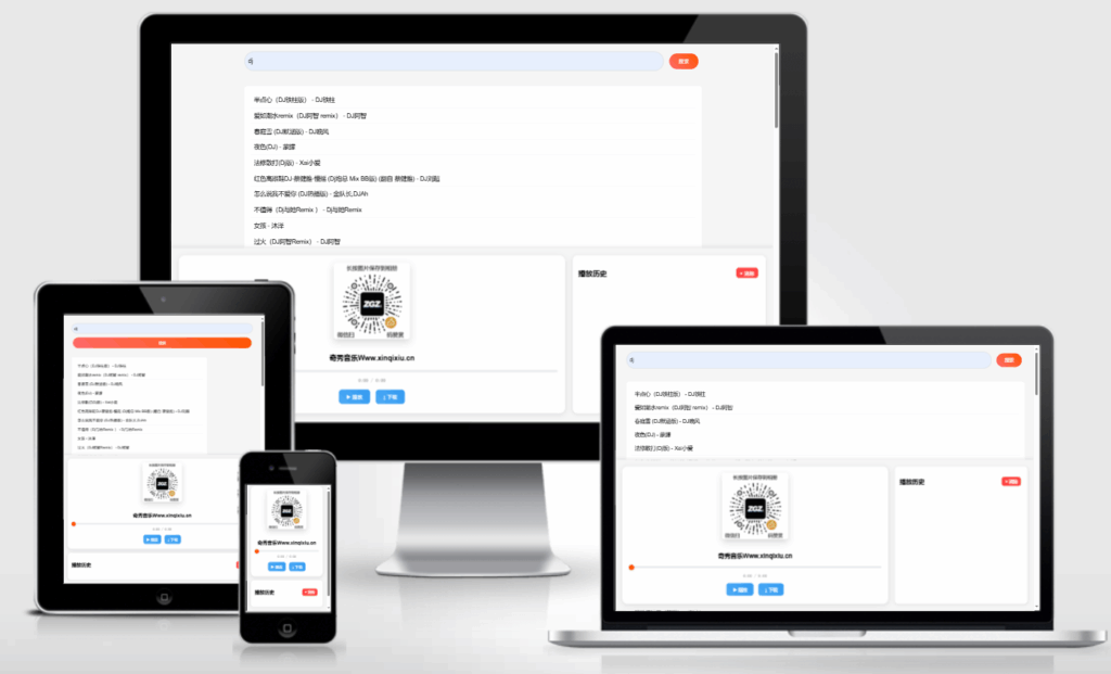 新增页面中心链接,优化自适应自效果,播放器移到底部并缩小,试听历史模块内显示,页内搜索音乐,歌曲试听,歌曲图片,音乐下载,无歌词,不支持联播。