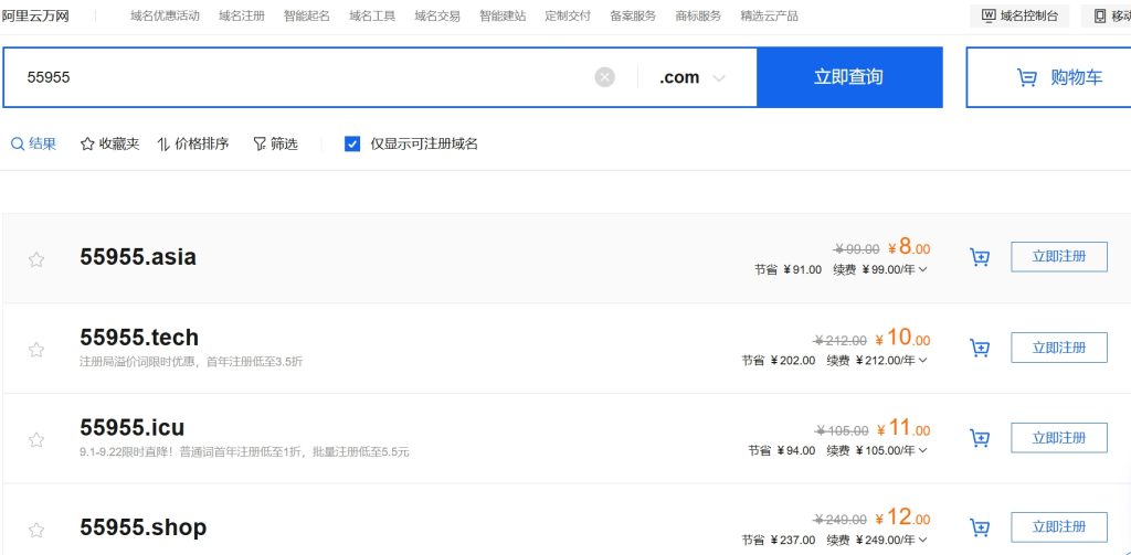 皖 a88888.com或 55955.com),点击搜索。 - 系统会告诉你这个域名是否可用,以及不同后缀(.com, .net, .xyz 等)的价格。.com 是最推荐的选择。